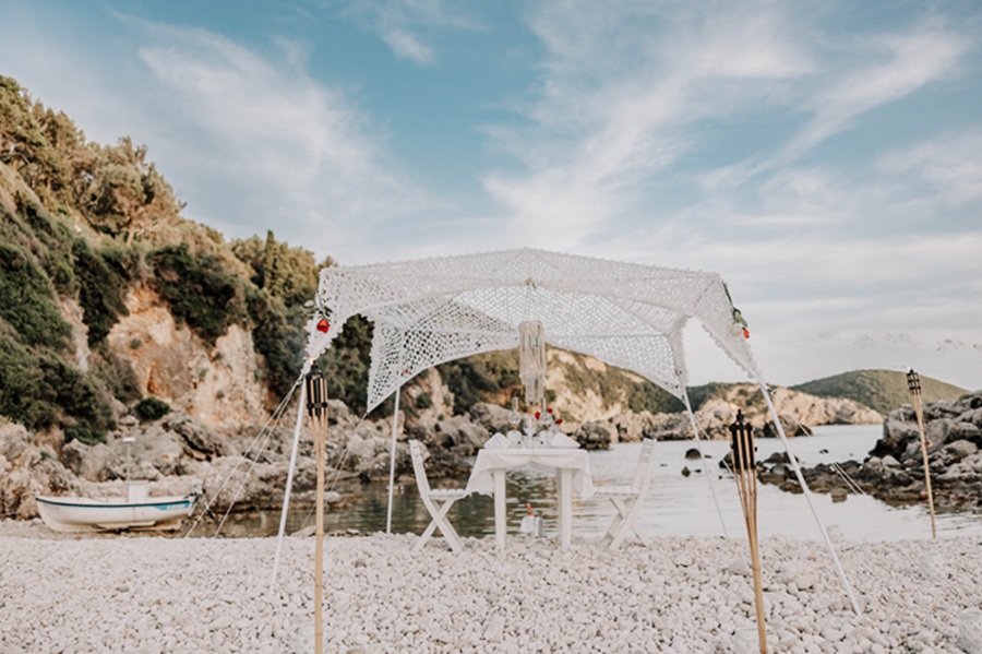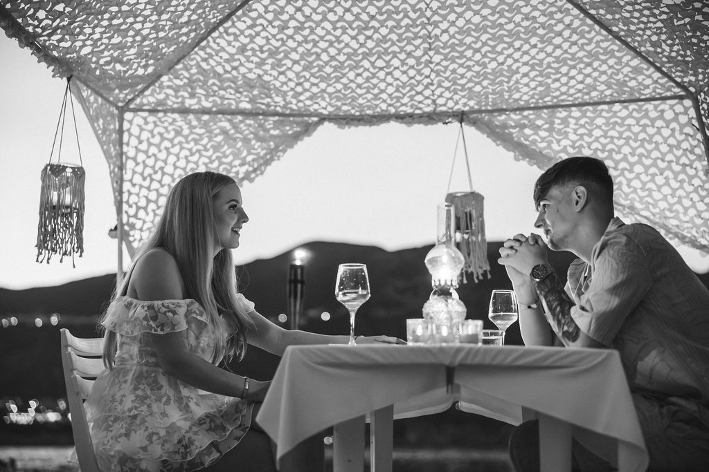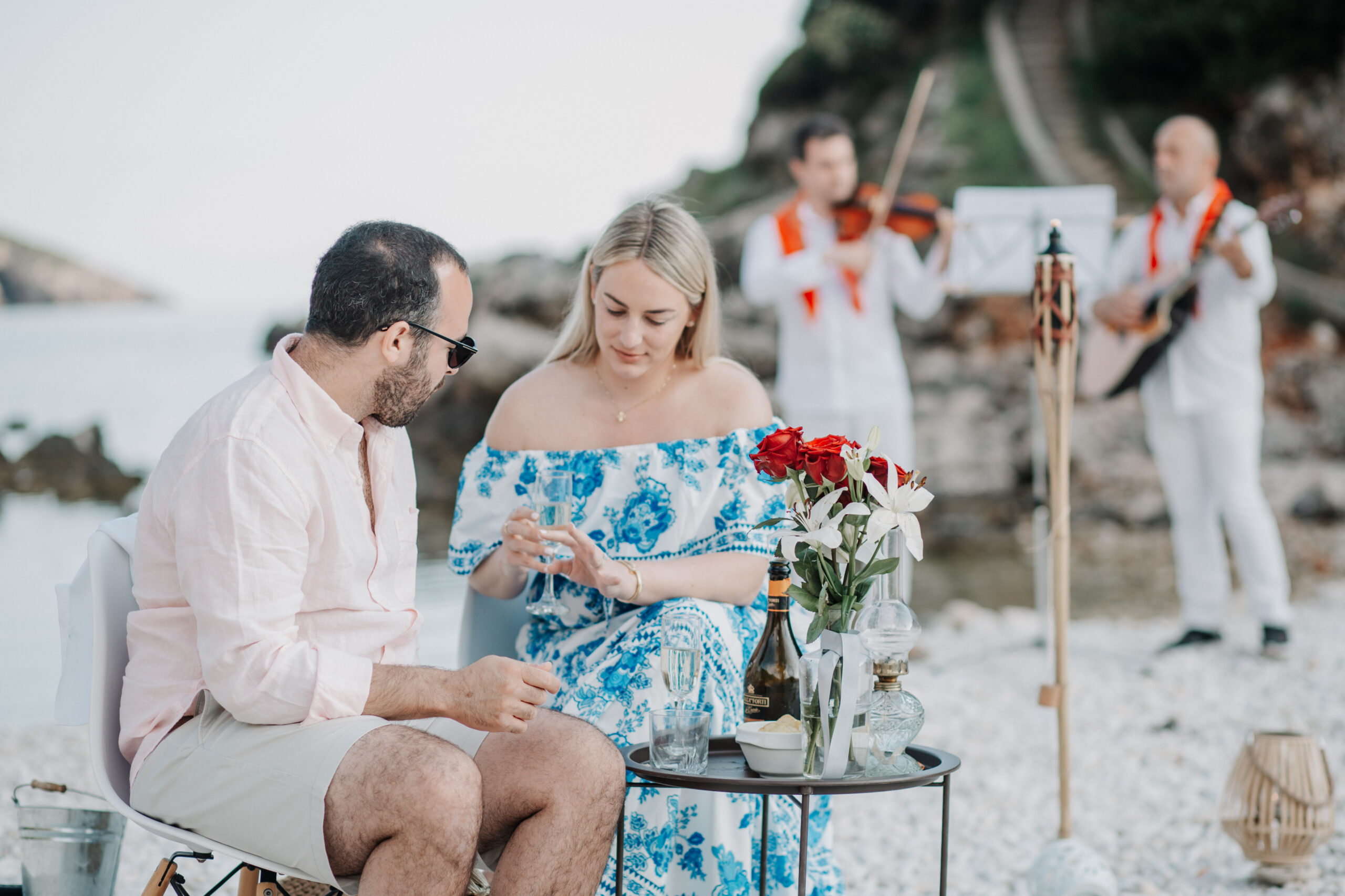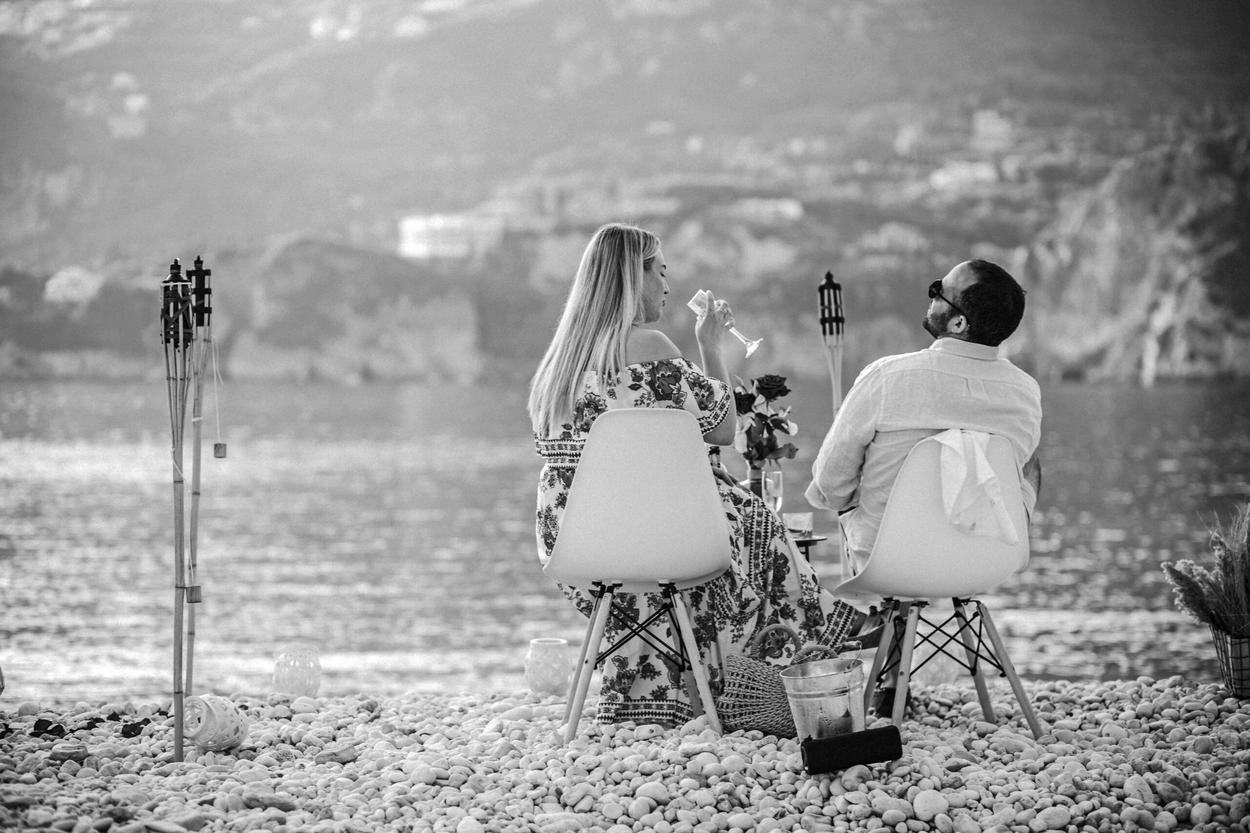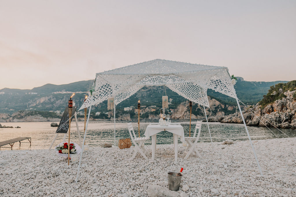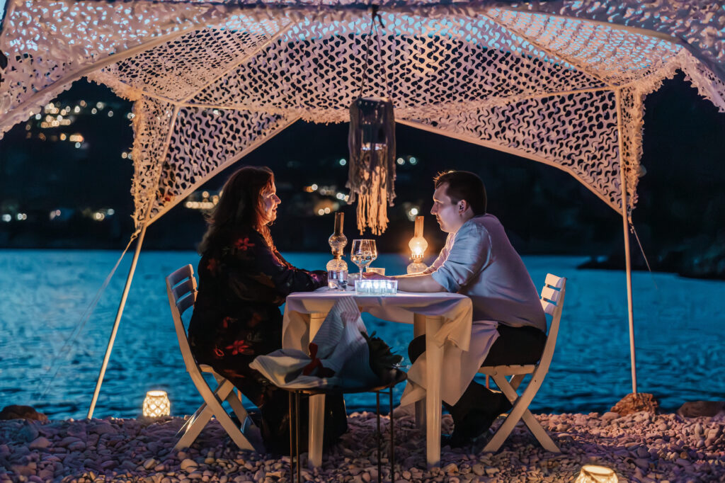 Just youher, and a simple yet breathtaking setup waiting on the sand. Lanterns flicker, the cushions are gently laid out, the sea glows in the last light of day.
